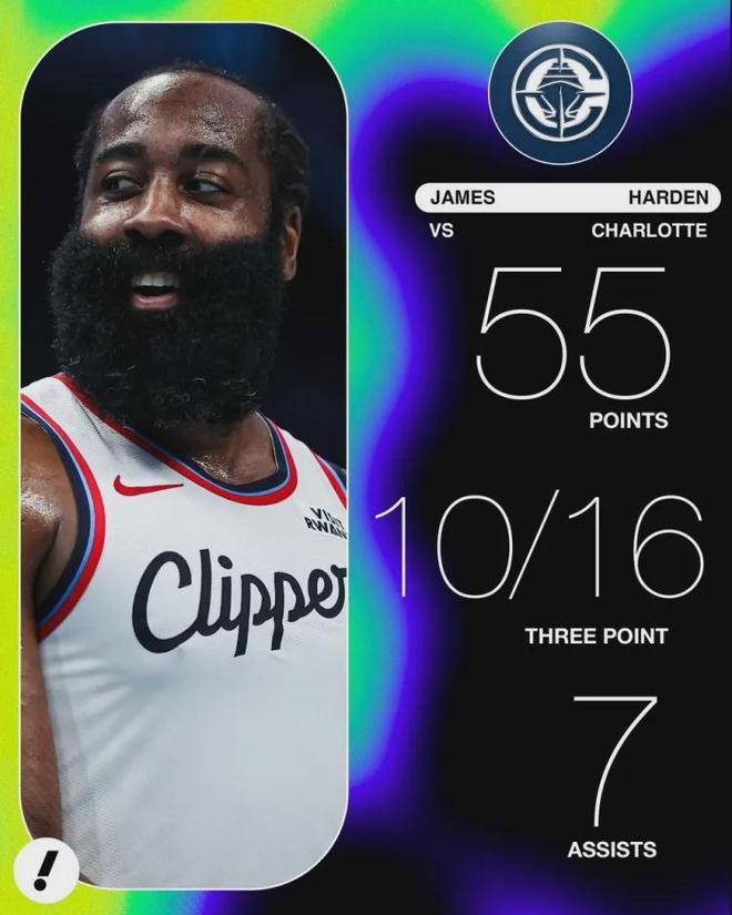 天啊,都36歲的人了,哈登投籃26中17,其中三分球16中10,罰球14中11狂轟55分外加3板7助,帶領快船131-116擊敗黃蜂。