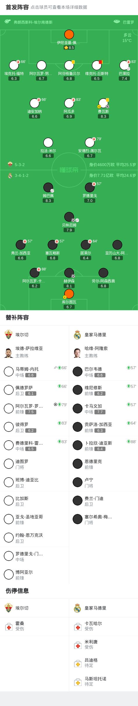 北京時間11月24日西班牙足球甲級聯賽 聯賽 第13輪,埃爾切主場對陣皇家馬德里。上半場,兩隊均無建樹。下半場,費瓦斯打破僵局。貝林厄姆擺渡,赫伊森扳平比分。阿爾瓦羅破門幫助主隊再次領先,姆巴佩助攻,貝林厄姆再次扳平比分。全場比賽結束,皇馬2-2戰平埃爾切,遭遇連續三場比賽不勝。