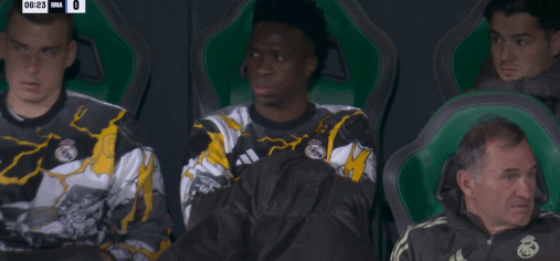 第7分鐘,鏡頭給到場邊,維尼修斯替補席待命